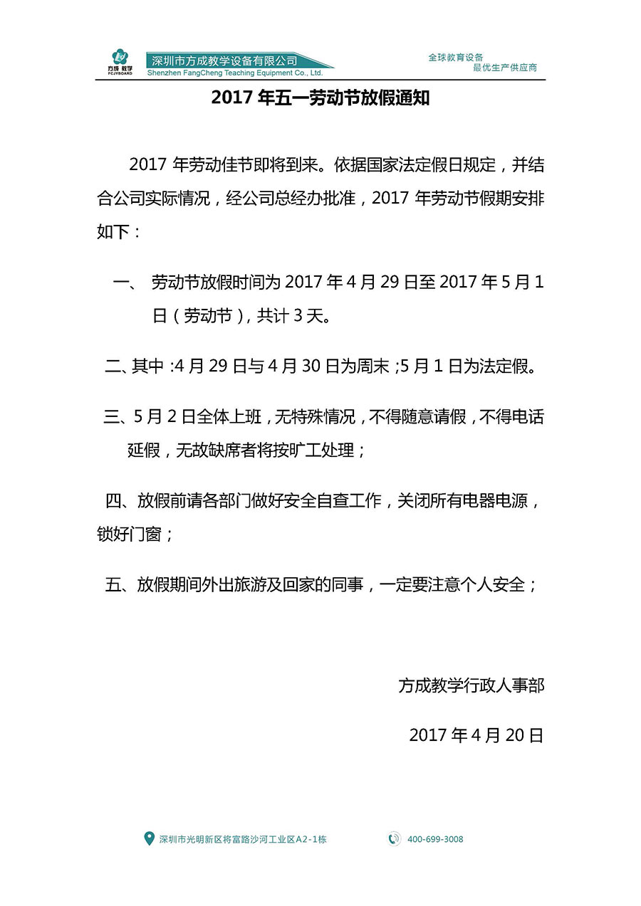 2017年劳动佳节即将到来。依据国家法定假日规定,并结合公司实际情况,经公司总经办批准,2017年劳动节